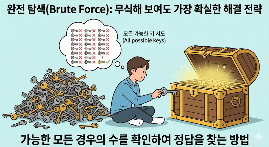 알고리즘 문제를 접하다 보면 '최적화'나 '효율성'이라는 단어에 강박을 갖기 쉽습니다. 하지만 컴퓨터 과학의 역사에서 가장 오래되고, 가장 확실하며, 때로는 가장 강력한 문제 해결 방법은 바로 "무식하게 다 해보기"입니다. 이를 전문 용어로 완전 탐색, 영어로는 브루트 포스(Brute Force)라고 부릅니다. '짐승(Brute)'과 '힘(Force)'의 합성어인 이 알고리즘은 지능적인 전략보다는 컴퓨터의 압도적인 연산 속도를 믿고 밀어붙이는 방식입니다. 보안 시스템을 뚫으려는 해커부터 복잡한 퍼즐을 푸는 인공지능까지, 모든 알고리즘의 기초가 되는 완전 탐색의 세계를 탐구해 보겠습니다.