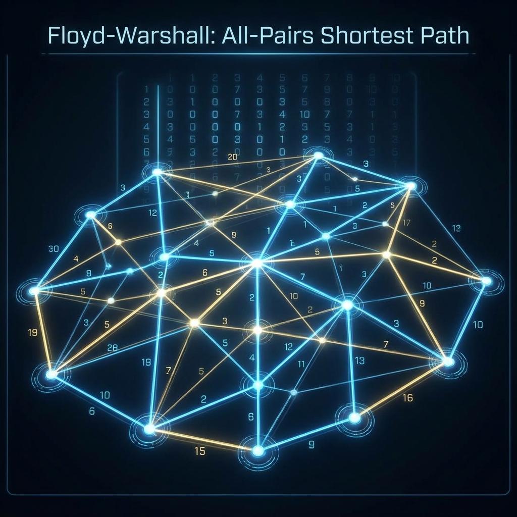 앞서 우리는 다익스트라(Dijkstra) 알고리즘을 통해 '어느 한 출발 도시'에서 '나머지 모든 도시'로 가는 최단 경로를 구하는 방법을 배웠습니다. 하지만 현실의 비즈니스 요구사항은 훨씬 가혹합니다. 만약 서울에서 부산을 가는 최단 거리뿐만 아니라, "지도상에 존재하는 대전, 대구, 광주 등 모든 도시에서 출발하여 또 다른 모든 도시로 도착하는 최단 거리를 하나의 표(Matrix)로 싹 다 뽑아주세요"라는 요청이 들어오면 어떻게 해야 할까요? 다익스트라 알고리즘을 N번 반복해서 돌릴 수도 있겠지만, 코드가 몹시 지저분해지고 로직이 복잡해집니다. 이럴 때 불과 세 줄의 반복문만으로 마법처럼 모든 정점 간의 최단 경로를 한 번에 계산해 내는 우아한 알고리즘이 바로 '플로이드-워셜(Floyd-Warshall)'입니다.