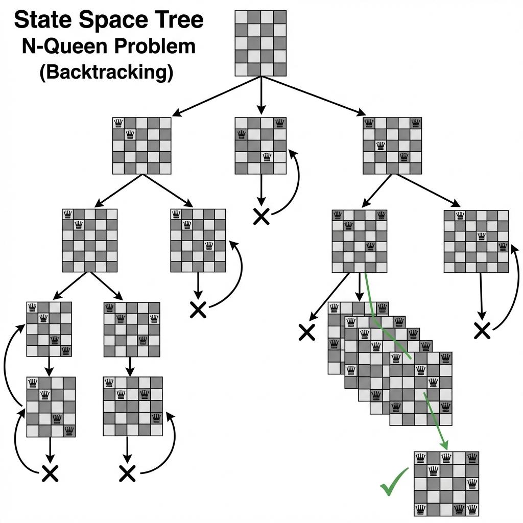 - 이전 상태로 복구: 더 이상 퀸을 놓을 곳이 없다면, 미련 없이 이전 줄로 되돌아가서 방금 놓았던 퀸을 집어 들고 다른 안전한 칸으로 위치를 옮깁니다. 그리고 다시 다음 줄을 탐색합니다.