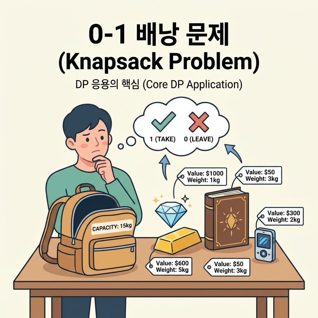 제한된 자원 속에서 최대의 효율을 뽑아내야 하는 상황은 경영학, 물류, 그리고 컴퓨터 공학에서 가장 빈번하게 마주하는 최적화 문제입니다. 그중에서도 0-1 배낭 문제(0-1 Knapsack Problem)는 동적 계획법(Dynamic Programming)의 정수라고 불릴 만큼 정교한 논리 구조를 가지고 있습니다. 단순히 가성비가 좋은 물건부터 담는 '그리디(Greedy)' 방식으로는 해결할 수 없는 이 문제의 본질을 파헤치고, 전역 최적해를 찾아가는 DP의 마법 같은 과정을 상세히 정리해 보겠습니다.